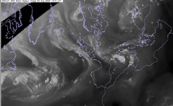 In the far right of the image over New Foundland we see a dark elongated shape. This area indicates where a jet lies to the north of Alex. The relative dark contrast indicates that dry air high PV is being drawn down from the stratosphere. An upper trough lies over the central Atlantic extending from Greenland with an old low also evident to the west of the UK.An area of cloudiness lies to the north of the jet over the Labrador straits, this area of cloudiness is an occluding frontal system and weak baroclinic zone.