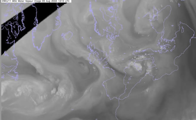 In the far right of the image over New Foundland we see a dark elongated shape. This area indicates where a jet lies to the north of Alex. The relative dark contrast indicates that dry air high PV is being drawn down from the stratosphere to relatively low levels . An upper trough lies over the central Atlantic extending from Greenland with an old low also evident to the west of the UK.