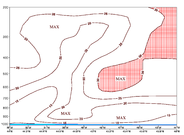 The wind field has now expanded, with a core of strong winds remaining at low levels. At high levels we see the first indication of the westerly jet stream, this core of strong winds extends down to lower levels to near 600 hPa.