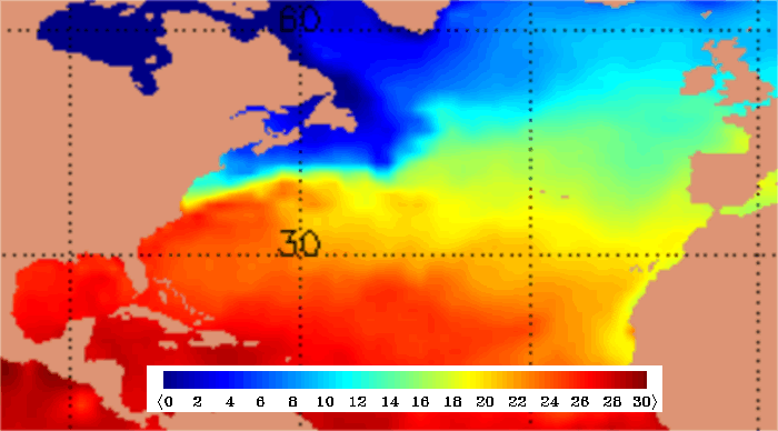 The above image shows an overlay of the track of hurricane Alex. Note how the hurricane moves northeast and keeps to the warm side of the marked temperature gradient in the western Atlantic.