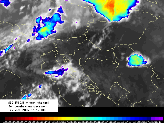 Few minima of the cloud top temperature (above -60 °C) appeared over the border of Croatia and Bosnia and Hercegovina. These cold cloud tops consist of ice particles.