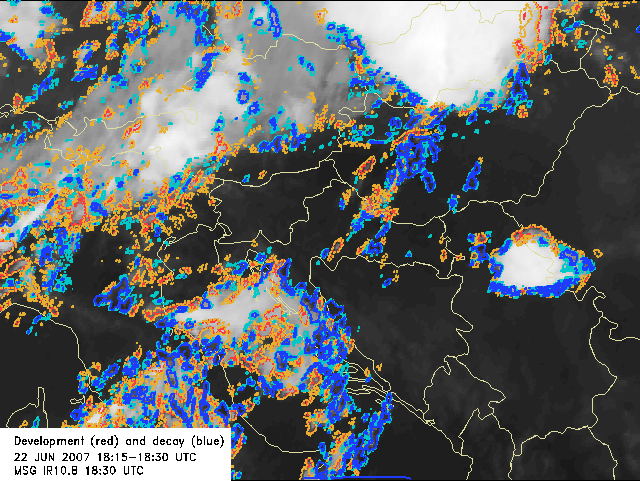 The first sign of development (surrounded with orange and red) can be noticed over the north Adriatic at 1900 UTC. The growth and movement of the convective cells can be monitored. |