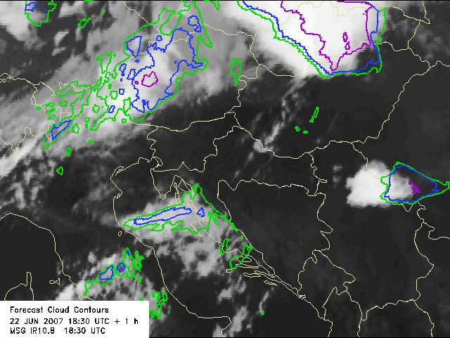 Forecast cloud contours show the expected position and shape of the cloud structures