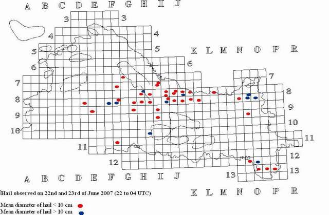 Mean diameter of hail measured by hail-pads on 22nd and 23rd June