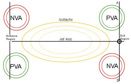 Fig. 2 Jet Stream orientation and position of the PVA and NVA maxima.