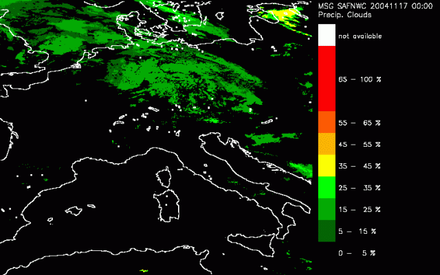 In the first few image the former depression "Quimburga" is moveing over the continent. Within this frontal sytsem widespreaded areas are obvious diagnosed with rain, with increasing chance of rain on the northside of the Alps. Then, as time evolves the RaCy enters the FOV. At 19 November around 00UTC the Rapic Cycolgensis is found over Western Europe. The most active parts in relation to precipiattion is found in the Cloudhead where the high clouds are very likely causing rain over the northern part of the Netherlands and Germany. As a result of barrage clouds also on the Alps in France much rain is likely in this area. As the RaCy moves east the most active part as precipitation is concerned is the cloud head with its high clouds.