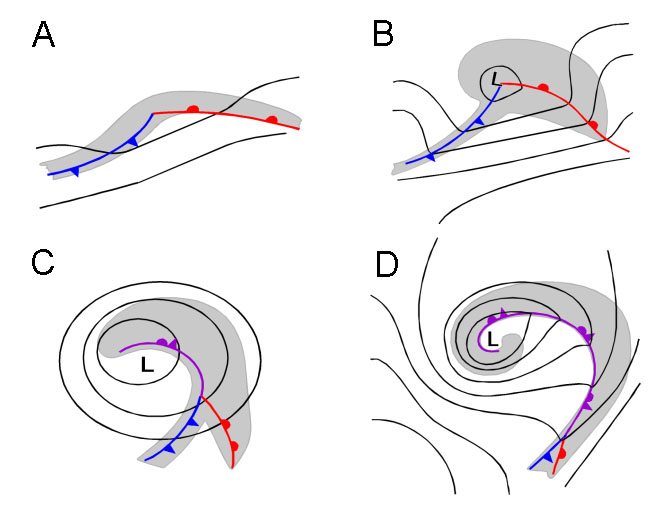 In the above Figure 1 this lifecycle is graphically represented with the development of the Wave (A). Second the cyclonic circulation and the establishment of a low pressure area (B). In the third image (C) the cold front overtakes the warm front and an occlusion-front is formed. Lastly, the development of the occlusion continues and the cyclone has reached its mature stage (D).