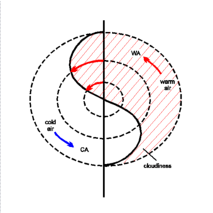 Looking only at the kinematic processes a very simple description of the development of the S-shape cloudiness as well as of the typical distribution of the temperature advection field can be given. The cyclonic vorticity deforms the cloud band edge and transports cold and warm air, leading to typical positions of WA and CA maxima (see Key parameters ). The WA maximum within the cloud bulge as well as PVA, indicating the deepening of the low, contributes to the increase of cloudiness in the Wave area.