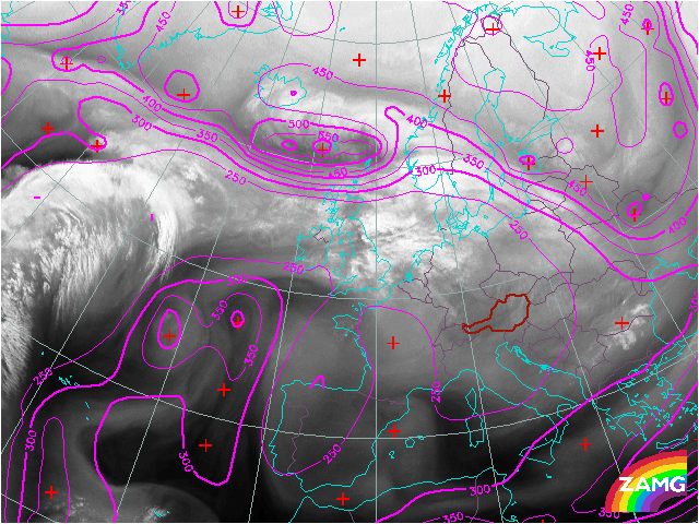 A broad PV anomaly can be seen in the backside of the dry slot which is situated to the north of the area of dissolving clouds. This dry slot can be clearly seen at this time step. PV=1 reaches down to 500 hPa in this area which indicates a lowering of the tropopause, which hints at a cyclogenetic process. The model does not give a good fit to the dry slot at this time step. However, the trough which extends to the South of the Alps corresponds well with the area of cloud dissolution and indicates that a second process is going on.