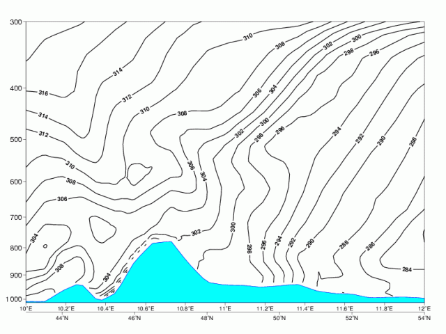 The isentropes of the equivalent potential temperature (ThetaE) show a cold-front-inclined crowding zone. The distribtion is typical for a low-level cloud head and its associated frontal cloud band.