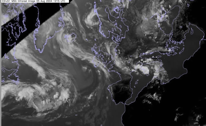 In the far right of the image over New Foundland we see a dark elongated shape. This area indicates where a jet lies to the north of Alex. The relative dark contrast indicates that dry air high PV is being drawn down from the stratosphere. An upper trough lies over the central Atlantic extending from Greenland with an old low also evident to the west of the UK.An area of cloudiness lies to the north of the jet over the Labrador straits, this area of cloudiness is an occluding frontal system and weak baroclinic zone.