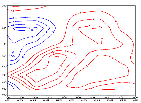 The whole area of the forward inclined baroclinic zone and the leading part of the isentropic trough feature is under the influence of pronounced WA. The maximum of WA is found within the lower levels of the troposphere very close to the area where the forward inclined crowding zone reaches the surface. A secondary pronounced area of WA can be found within the upper levels of the troposphere on the rear side of the isentropic trough. This area is situated at approximately 300 hPa and indicates the tropopause. The lower and mid-levels of the troposphere are characterized by pronounced CA. The zero line of temperature advection is close to the minimum of the isentropic trough in the lower and mid-levels of the troposphere.