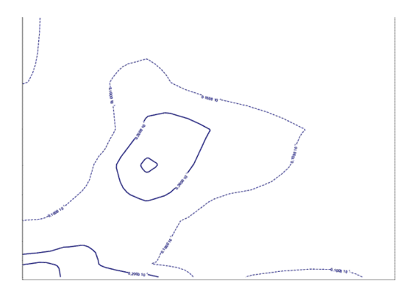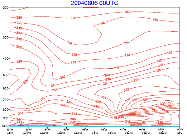 The isentropes of the equivalent potential temperature reveal a distinct trough structure indicating the warmer air which has been lifted and the baroclinic zone of a surface front. In this case the upper level trough is forward inclined with height. To the east the isentropes still reveal an unstable stratification. However this is less than 6 hours prior.