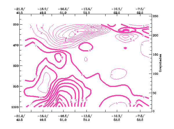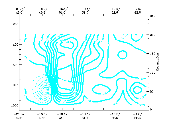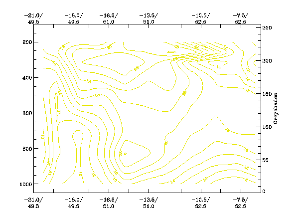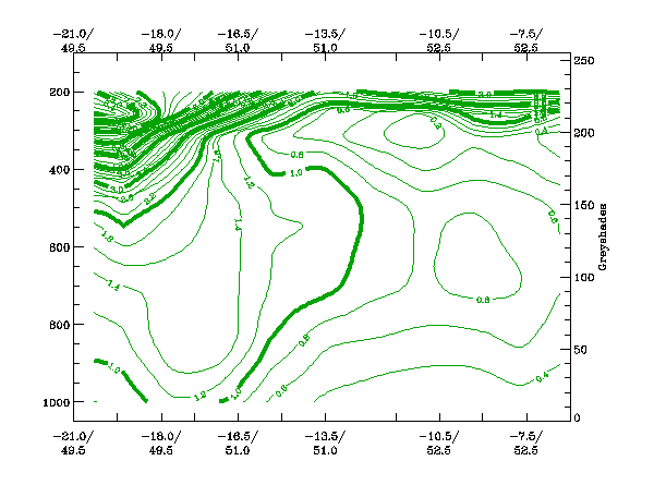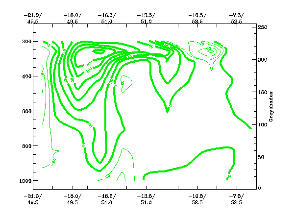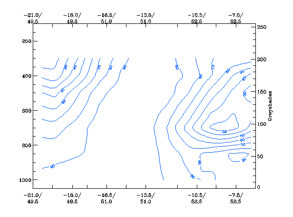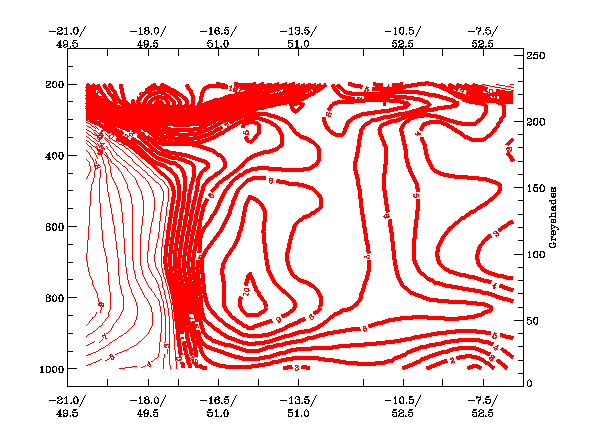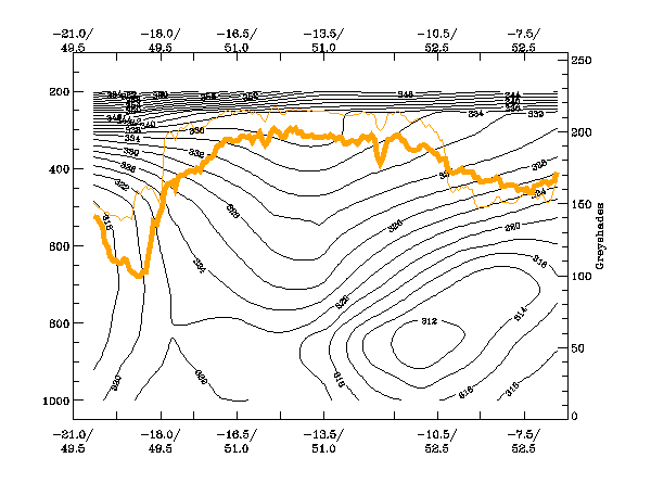 The high values in the IR image are clearly reflected in the pixel values in this cross section. The values of WV are higher than the IR values which indicates that there an intrusion of drier stratospheric air to the rear of the development.