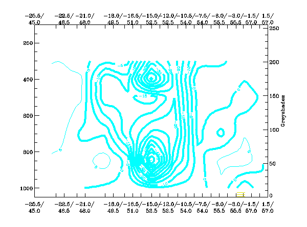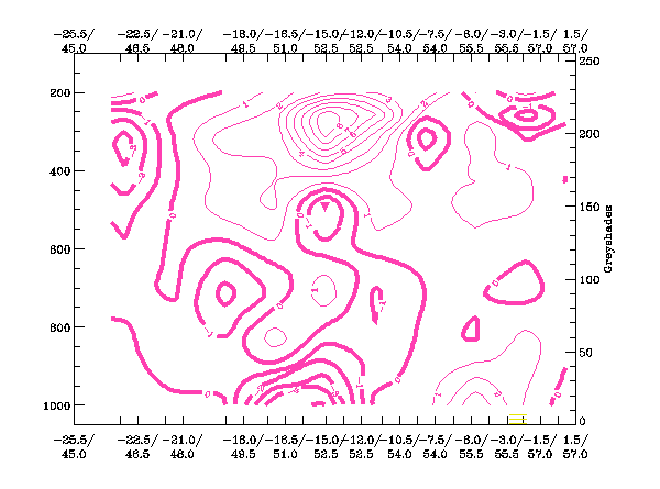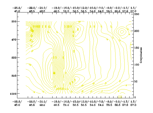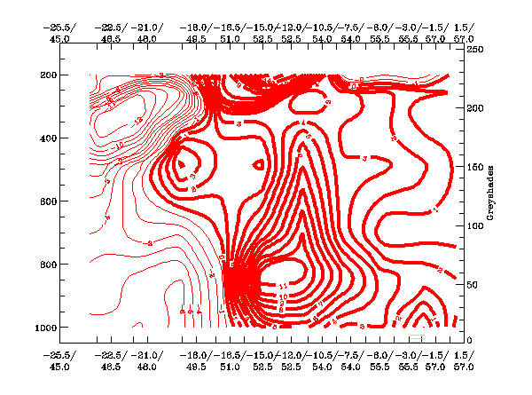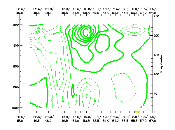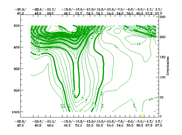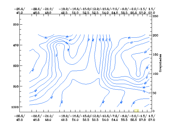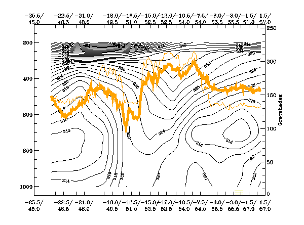 The high values in the IR image are clearly reflected in the pixel values in this cross section. The values of WV are lower than the IR values to the northwest of the system, this signal implies that no dry air is present at high levels in this area. We see lower WV values within the remainder of the cross sectional area, signifying an intrusion of drier stratospheric air especially within the hook of the storm.