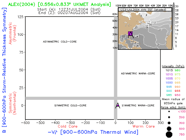 In the right of the upper screen we will follow the path of alex as it tracks from position A to position Z at the end of the sequence. In the main screen the change from symmetric to assymetric, from warm to cold core can be followed. The size of the cyclone (mean radius of the 925-hPa gale force wind region) corresponds to the size of the solid circles along the phase trajectory (largest shown is approximately 500 km). Circle shading corresponds to the intensity of the cyclone. The
