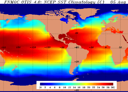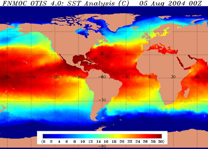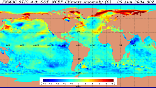 The brighter colours indicate where the sea temperature was above the climatological mean. It is interesting to note that during 2004 the sea temperatures over the western atlantic where hurricane Alex first formed saw sea temperatures up to 5 degrees warmer than the climatological mean.
