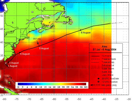 The occurrence of un-seasonally high sea temperatures during 2004 meant that Hurricane Alex formed further north and earlier in the year at 30.6N 78.6W, approximately 500 KM east of the Georgian coast and with a central pressure of 1010 hPa.