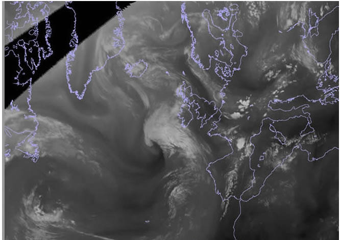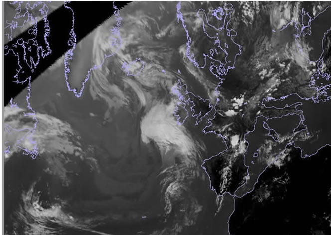 As the upper trough to the west of ex-hurricane Alex extends and sharpens the depression begins to re-intensify. On all the MSG channels shown here a developing cloud head can be seen and on both water vapour channels a very distinct dark grey shape can be seen to the west of the upper cloud.