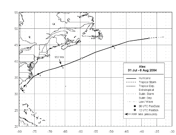 After passing the Outer Banks, Alex turned away from land and accelerated as it became embedded in a deep layer of west-southwesterly flow. Alex strengthened and became a major hurricane (Category 3) at 0000 UTC 5 August, with winds of 105 KT and a minimum pressure of 957 mb. At this time Alex was at 38.5° N (385 n mi south-southwest of Halifax, Nova Scotia), moving east-northeastward at 20-25 KT, and over waters just above 26°C - not factors normally associated with major hurricanes. Only Hurricane Ellen of 1973 attained major hurricane status farther north. While the basic environmental current surrounding Alex was low in shear, the cause of this unexpected strengthening remains unknown.