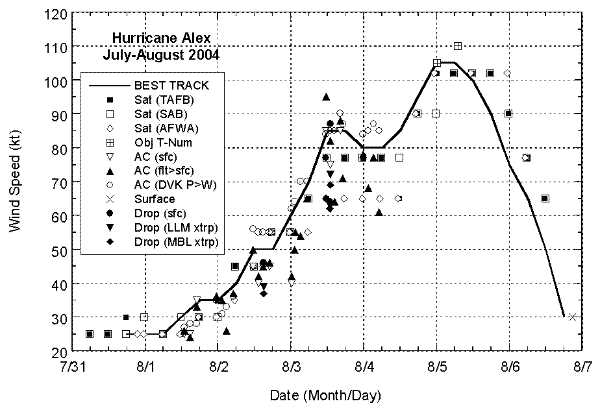 Figure 2: Selected wind observations and best track maximum sustained surface wind speed curve for Hurricane Alex, 31 July - 6 August. Aircraft observations have been adjusted for elevation using 90%, 80%, and 80% reduction factors for observations from 700 mb, 850 mb, and 1500 ft, respectively. Dropwindsonde observations include actual 10 m winds (sfc), as well as surface estimates derived from the mean wind over the lowest 150 m of the wind sounding (LLM), and from the sounding boundary layer mean (MBL). Objective Dvorak estimates represent linear averages over a three-hour period centered on the nominal observation time.