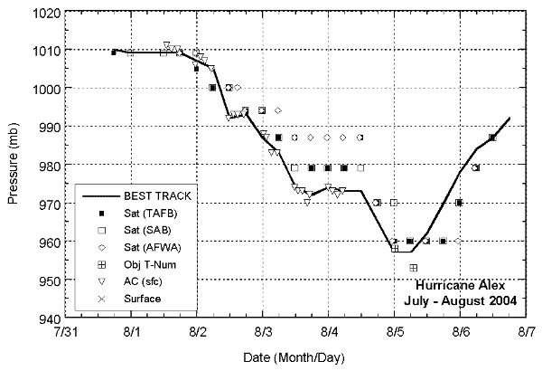 Figure 3: Selected pressure observations and best track minimum central pressure curve for Hurricane Alex, 31 July - 6 August. Objective Dvorak estimates represent linear averages over a three-hour period centered on the nominal observation time.