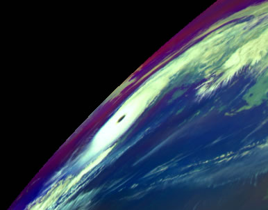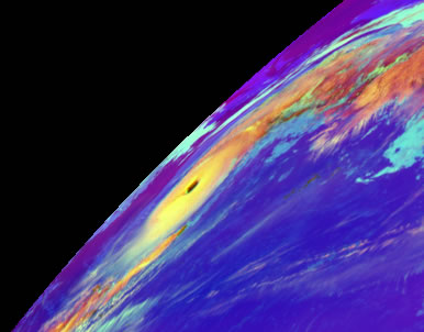 A comparison of these two images 24 Hrs apart shows that the convective central eye has begun to decay. The bright yellow convective cells that were evident have now become disorganised.