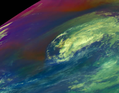 The severe convection RGB shows that the central eye and circulation is built up of young convective cells and these are shown as bright yellow cells with older, mature convection, highlighted in a reddish colour.