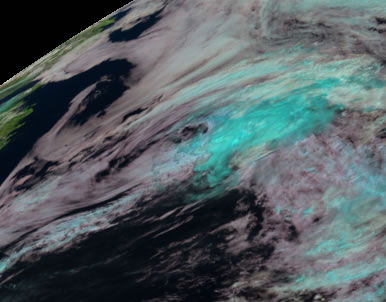 As transition occurs the hurricane develops a frontal structure which can be seen ton the satellite imagery. The central eye of the hurricane becomes obscured as a cloud shield is moved across the eye obscuring it from view. The natural colour RGB enables us to see the large stratiform clouds the west of the hurricane.