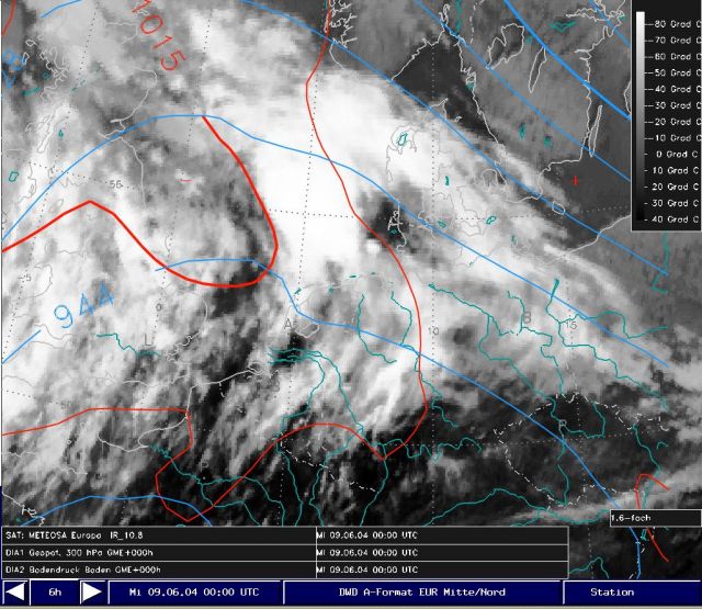 Till 12 UTC the surface low intensified (due to an increased direct circulation caused by the solar irradiation at the southern edge of the super cell). The convective cell complex remained at the front site of the short wave upper air trough.
