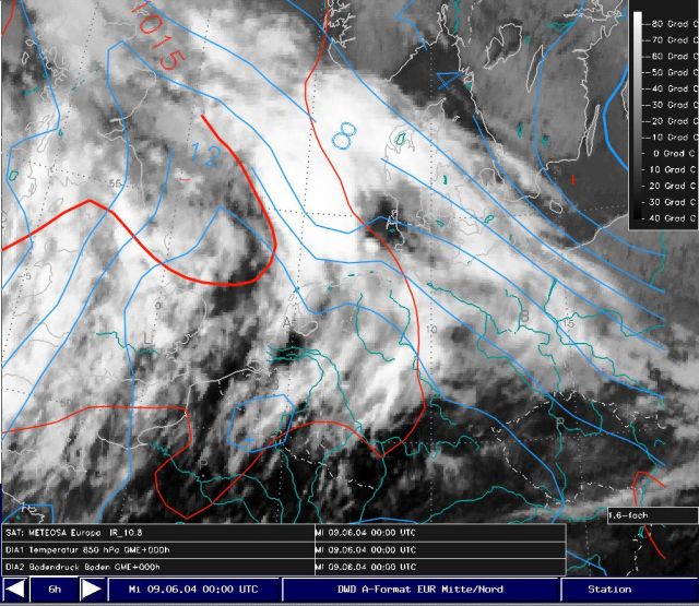 This image shows the bright cloud complex mainly at the warm site of the warm front (temperature 850 hPa, blue) northeast of the surface trough (red). The blue lines exhibit a wave structure indicating that the super cell developed at a warm front wave.