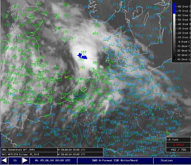 This image reveals near Hamburg an instructive example of the development of a mesoscale high pressure system and a confluence just after passing of the super cell. South of the blue area with low cloud top temperatures a new cell (1 blue pixel) started to develope. That was the onset of the so-called cell splitting.