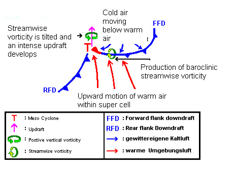We assume that the synoptic preconditions (vertical wind shear, potential instability, dynamical forcings) are fulfilled. In the following the main features of a super cell will be explained.