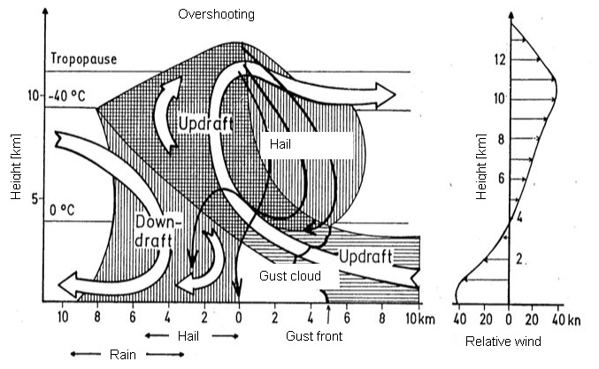 Schematic cross section through a super cell with hail and relative wind. The super cell is moving from left to right. In the lower levels we oberserve a streaming into the super cell whereas in the higher levels an outward streaming happens. Due to the baroclinic situation the updraft is tilted yielding hail. We observe hail behind the gust clouds and a few kilometres after the passage of the gust front. In some cases hail is also possible several kilometres before the super cell. After the onset of hail the downdraft arrives the location with prevailing moderate to severe rain. At the top of the updraft overshooting is likely.