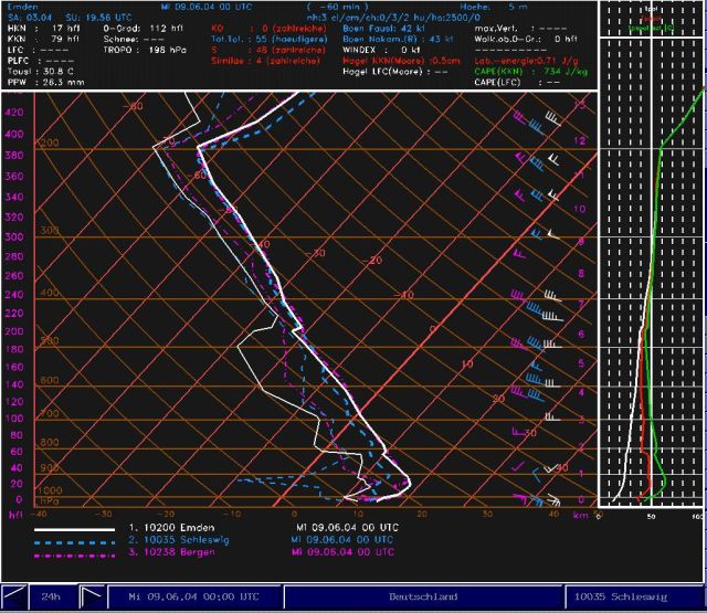 This image shows the radiosoundings from 00 UTC at 3 stations in Northern Germany (Emden, Schleswig, Bergen) that were near-by the pass of the super cell during the next hours. From the left part of the picture we obtain a tropopause at -64°C in 12 km height, a strong vertical wind shear (especially Emden, white curve). We find for Schleswig and Emden (blue, violet) a jet in 5 and 6 km, respectively that is a hint to extreme convective events. Emden and Bergen (letter not shown) exhibit for all thunderstorm indices a risk to severe convection. Gusts of up to beaufort 9 are derived (method of Nakamura). The right part of the picture shows the the vertical profiles of the potential temperature (Tpot, white), pseudopotential temperature (tpspot, red) and tpspot-sat (saturated air, green). The red and green curve exhibit a potential instability between about 1 and 6 kilometres (decreasing temperatures with height).