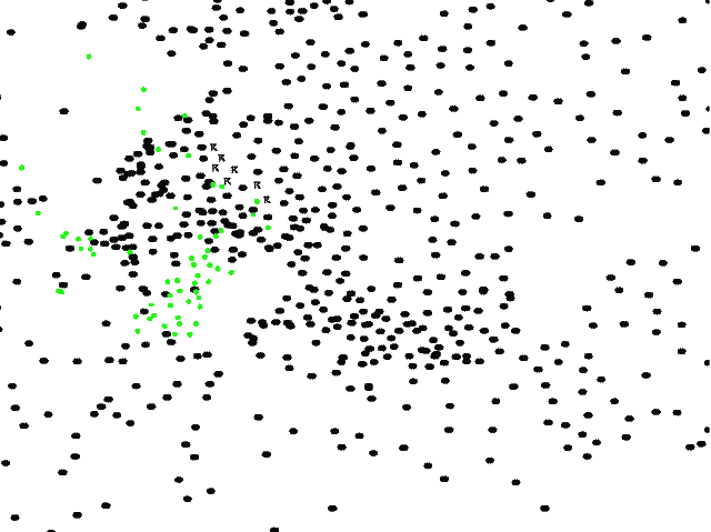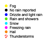Rain (green dots) and thunderstorms are observed over central Europe and are found just behind the frontal system.