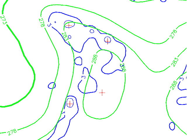 A pronounced theta-E maximum is found over Southeastern Europe indicating high danger for TS development (value of 333K!). The convergence and its instability are already reflected in IR10.8 by some Cbs.