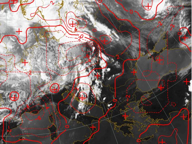 In this first image we see the frontal system that is cyclonically curved over eastern part of Europe. Western and Central Europe is marked by distinct cold air advection maxima.
