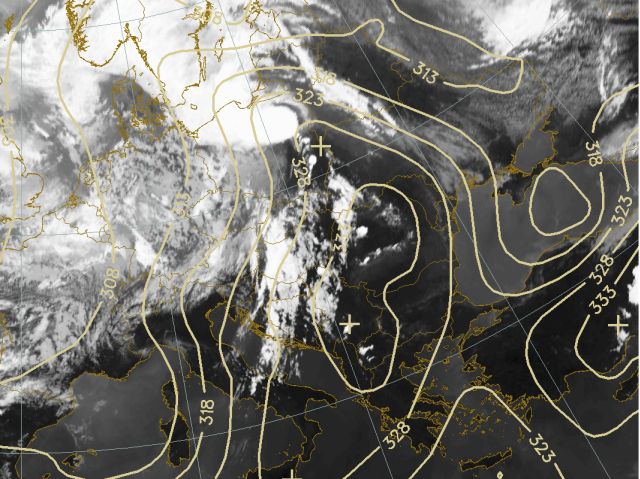 A pronounced theta-E maximum is found over Southeastern Europe indicating high danger for TS development (value of 333K!). The convergence and its instability are already reflected in IR10.8 by some Cbs.