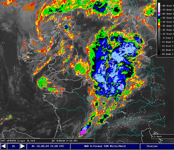 Figure 1: Meteosat 8 IR10.8: 18th August 2004: 21 UTC. The squall line just after its mature state (CTT up to -65°C, violet areas). It moved at up to 100 km/h and is now positioned over the Benelux-states and Germany.