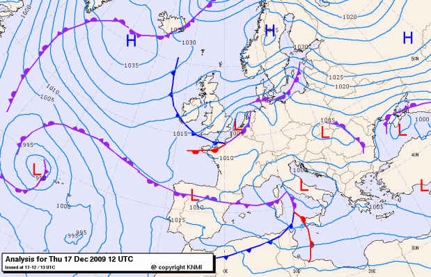 Figure 1.1: Surface chart 17 December 2009 12UTC. Belt of high pressure over Northern Europe dictating the weather - source KNMI