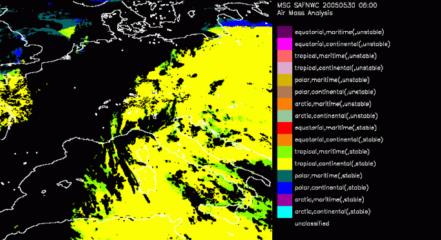 The Air Mass Analysis product of the SAFNWC aims to support the nowcasting applications through providing several products describing air mass characteristics. These characteristics are determined by the surface temperature, the moisture content of the airmass and the stability of the airmass derived from SAI (Stability Analysis Index). The criteria then allow a discrimination of about 16 different airmasses Because of the use of the surface temperature the AMA can only be calculated for cloudfree areas.