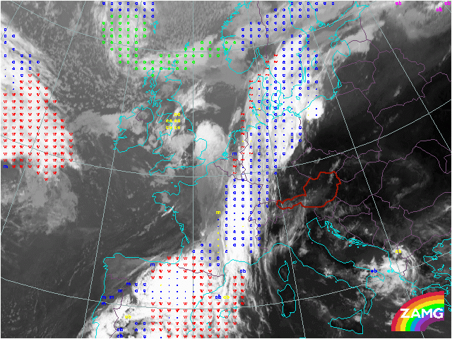 Around 11UTC the convection ahead of the front is about to start. North of the Alps the first cells just emerged and are positively identified as Cbs. The magenta colour again indicates that these cells are still developing and should be looked at in following timesteps.