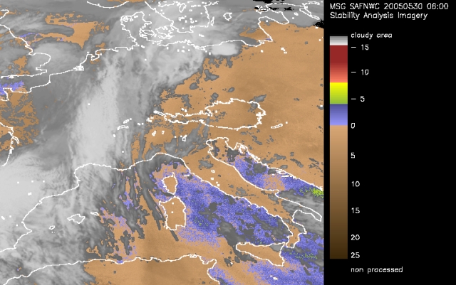 In the image the lifted index is presented. This stability index is the output of the SAI product of the NWC SAF. A negative value indicates an unstable air mass, while a positive value implies a stable air mass. The value is color-coded with reds and yellows being the most unstable and blues and beiges more stable. At this stage the region over Central Europe where the convection at a later stage will start is still recognised as stable. Further south over the Mediterranean and also over the coast of Croatia more unstable regions are recognised.