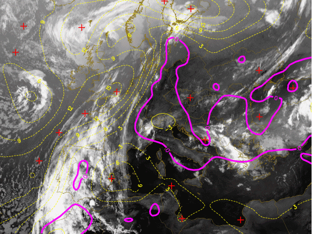 In this chapter the IR images are overlayed with the Showalter index. It gives a good indication where the atmosphere is unstable and where convective development may be expected. Showalterindices between 1 and 4 give the indication that thunderstorm are possible but that a trigger is still needed. From this treshold the chance on thunderstorms increase. Values under –3 are associated to very heavy thunderstorms. In this set of images the treshold of Showalter Index = 0 is pictured using the pink line. This allows an easy discrimination of the potential convective areas. Such an area can be seen here stretched over central Europe. Ahead of the frontal system and further to the east over Greece and Turkey an area with Showalter Index smaller than zero is found. Over Spain and further south, embedded in the front the atmosphere is unstable with SI < 0.