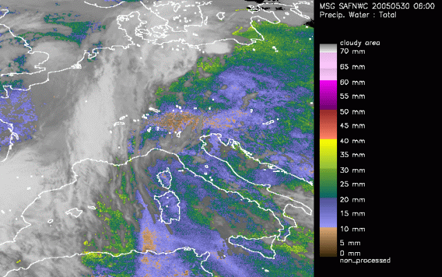 Ahead of the frontal system over Western Europe several colours are identified. Highest values for the TPW are found just ahead of the front (green colours) with maxima just over Algeria and also over northern Poland connected to the convective cells embedded to the frontal system in that region. The area of interest is found over the Alps and the Czech Republic. The Alps themselves show lower values for TPW that can be explained by the geography. Further to the east more blue colours are observed. They indicate values up to 20mm of potential rain.