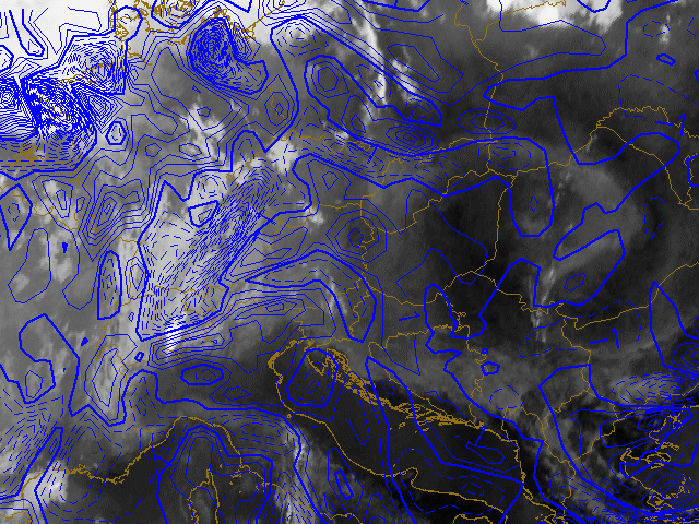 With help of the modelfields of the LAM model Aladin the divergence/convergence at 700 hPa is pictured. Striking at this instance is the region with convergence over the cold front explaining the existance of only low cloudiness. Ahead of this front already outflow and divergence is observed in the area later marked as prefrontal convergence.