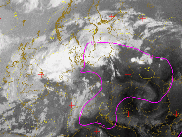 In this chapter the IR images are overlayed with the Showalter index. This index gives a good indication where the atmosphere is unstable and where convective development may be expected. A Showalter index between 1 and 4 gives the indication that thunderstorms are possible but that a trigger is still needed. From this treshold downward the chance on thunderstorms increase. Values under –3 are associated to very heavy thunderstorms. In this set of images the treshold of Showalter Index = 0 is pictured using the pink line. This allow an easy discrimination of the potential convective areas. Such an area can be seen here stretched over central Europe. South of the Alps (a region where the first signs of prefrontal convergence will be seen) the SI is even below –3.