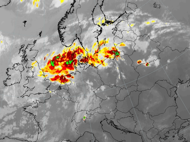 The first chapter dealing with the synoptic situation describes the convective developments seen over Central Europe using plain Meteosat infrared 10.8 μm. The channel is appropiate as it pictures the icing of high clouds quite clearly. In a sequence of 1 hour the relevant satellite image is presented and described.