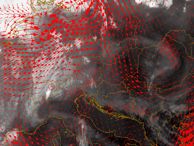 A different part of the satellite image is studied because of the use of the LAM model. By using the modelfields of Aladin the windfields in the boundary layer at 925 hPa are studied. The direction of the wind is marked by the arrows. At this timestep (some 8 hours before the convection starts!) the prefrontal convection line is already recognised with converging motions over Northern Italy, Austria (red circles) and further north in the Czech Republic and Poland.